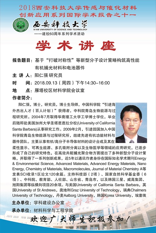 报告题目:基于“打破对称性”等新型分子设计策略构筑高性能有机捕光材料和电池器件