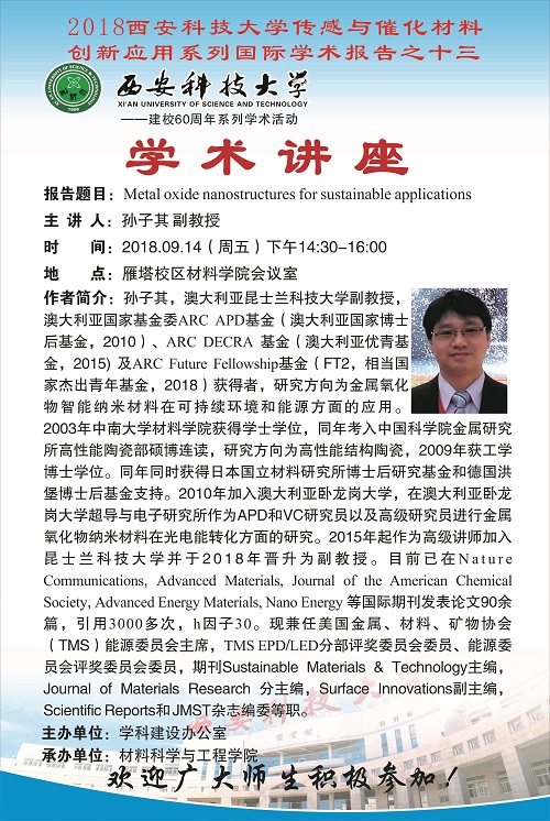 孙子其,澳大利亚昆士兰科技大学副教授,澳大利亚国家基金委ARC APD基金(澳大利亚国家博士后基金,2010)、ARC DECRA 基金(澳大利亚优青基金,2015) 及ARC Future Fellowship基金(FT2,相当国家杰出青年基金,2018)获得者,研究方向为金属氧化物智能纳米材料在可持续环境和能源方面的应用。2003年中南大学材料学院获得学士学位,同年考入中国科学院金属研究所高性能陶瓷部硕博连读,研究方向为高性能结构陶瓷,2009年获工学博士学位。同年同时获得日本国立材料研究所博士后研究基金和德国洪堡博士后基金支持。2010年加入澳大利亚卧龙岗大学,在澳大利亚卧龙岗大学超导与电子研究所作为APD和VC研究员以及高级研究员进行金属氧化物纳米材料在光电能转化方面的研究。2015年起作为高级讲师加入昆士兰科技大学并于2018年晋升为副教授。目前已在Nature Communications, Advanced Materials, Journal of the American Chemical Society, Advanced Energy Materials, Nano Energy 等国际期刊发表论文90余篇,引用3000多次,h因子30。现兼任美国金属、材料、矿物协会(TMS)能源委员会主席,TMS EPD/LED分部评奖委员会委员、能源委员会评奖委员会委员,期刊Sustainable Materials & Technology主编,Journal of Materials Research 分主编,Surface Innovations副主编,Scientific Reports和 JMST杂志编委等职。