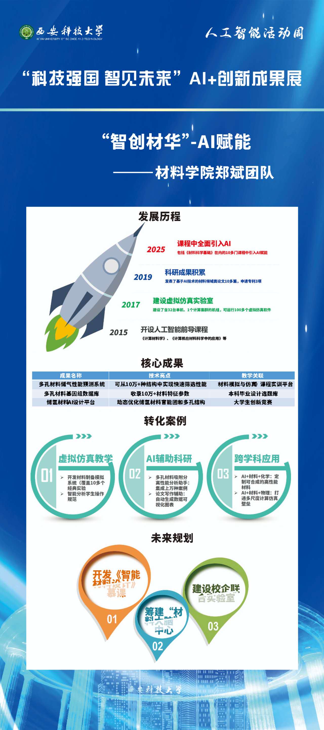 材料学院郑斌团队自2015年开设《计算材料学》等AI先导课程以来,通过建设虚拟仿真实验室、开发材料智能研发理论以及在课程中全面引入AI赋能等举措,构建了“理论奠基-平台支撑-科研反哺-全面融合”的系统化发展路径。利用研发的多孔材料性能预测系统、多孔材料基因组数据库、储氢材料AI设计平台,开发了材料制备模拟系统、多孔材料分析助手以及AI+材料+化学、AI+材料+物理等技术,为建设大学生实训平台、创新竞赛以及毕业设计选题等提供了技术保障和数据支撑。面向未来,本团队将重点开发《智能材料设计》慕课,筹建基于“材料大脑”中心的校企联合实验室,持续推动“智能计算-自动化实验-产业落地”闭环生态建设,为新材料领域拔尖人才培养与产业变革提供核心驱动力。