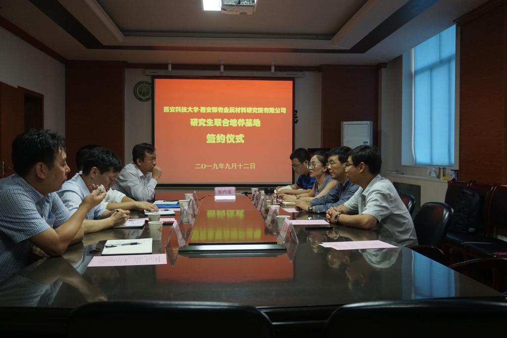 2019年9月12日,西安科技大学与西安稀有金属材料研究院有限公司签约共建材料类研究生联合培养基地协议在WilliamHill中文官方网站WilliamHill中文官方网站举行。材料学院副院长杨庆浩,西安稀有金属材料研究院副院长张于胜教授代表双方共同签署了共建研究生联合培养基地协议。