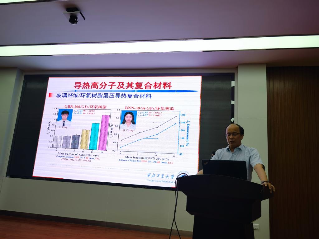5月24日,应材料学院高分子系李颖副教授邀请,英国皇家化学会会士、英国材料学会会士,世界排名前2‰科学家,陕西省杰出青年科学基金获得者,西北工业大学化学与化工学院副院长顾军渭教授做客“胡杨林大讲堂”,以“功能高分子复合材料”为题作学术报告。顾军渭教授结合自己的研究成果,介绍了功能高分子复合材料(导热、电磁屏蔽、吸波等)的功能/结构一体化设计制备及加工研究与应用现状。报告由材料学院杨庆浩副院长主持,WilliamHill中文官方网站师生200余人聆听了报告。
