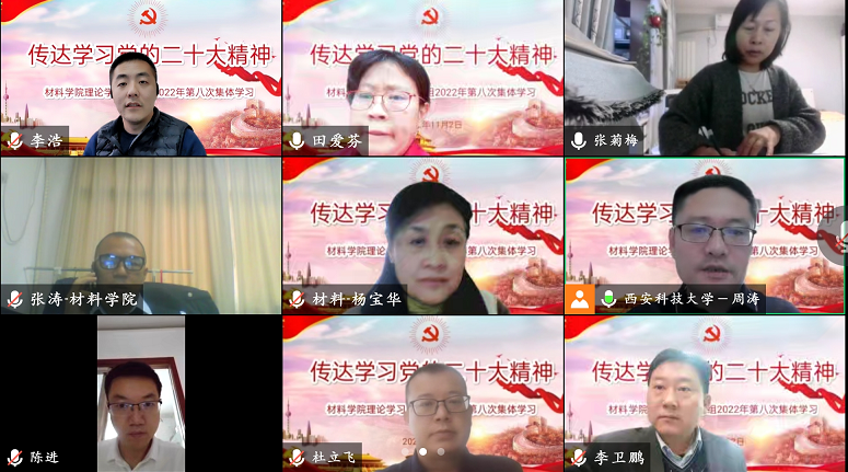 11月2日下午,材料学院线上召开党委理论学习中心组(扩大)学习会,专题转达学习贯彻党的二十大精神。材料学院党委书记周涛主持会议,学院党政班子成员、教工党支部书记、系(实验室)主任、全体科级干部、全体辅导员参加了学习会。