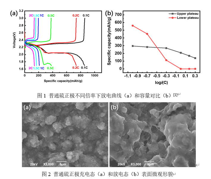 锂硫电池以硫作为正极活性物质,具有能量密度高、绿色环保、成本低等诸多优势。硫电极的还原放电过程可分为两个阶段:第一阶是固态硫还原成为多硫化锂,溶解在电解液中形成液相;第二阶段是溶解的多硫化锂进一步还原形成不溶的硫化锂,沉积在电极表面,造成电极钝化。